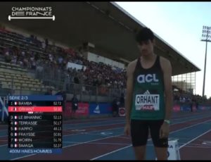 Elouan ORHANT participait aux Elites pour la première fois. Un peu de stress et un gros manque d’essence l’empêchent de se rapprocher de son record, il réalise 55″15 sur 400m Haies.
